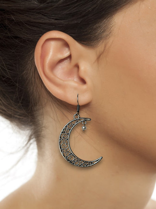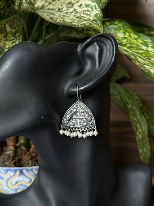 Peacock Engraved German Silver Earrings with Dangling Pearls