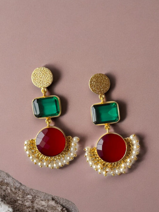 Gold Replica Green & Red Silk Stone Earrings with Dangling Pearls