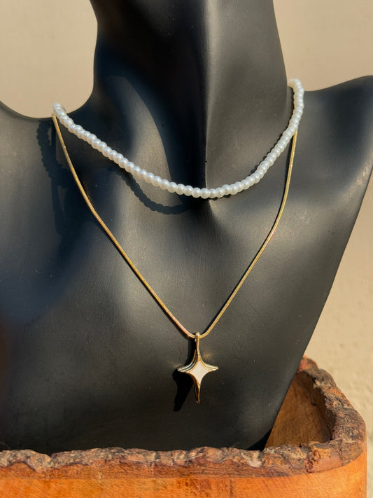 Pearl Two-Layered Chain Statement Classic Necklace with Star Pendant